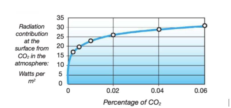 The influence of CO2 as a GHG decreases logarithmically as its atmospheric concentration increases. The first 100ppm (parts per million) of CO2 causes some 80% of the GHG effect, and each increment thereafter, successively less.